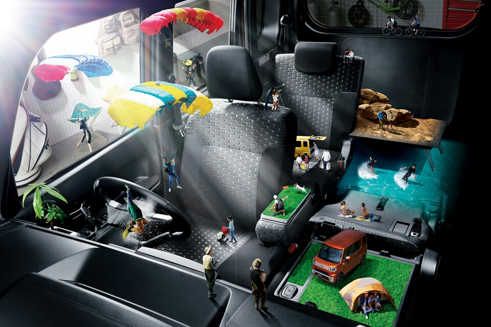 ボックススタイルのキャビンは室内高も十分にあり、居住性は高そうだ。大型のセンターディスプレイに加え、コンセプトモデルながらバックモニター用のディスプレイも装備し実用性に配慮しているのが見てとれる。
